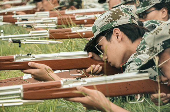 同学们认真领悟,积极准备,运用学习到的动作要领练习各类射击姿势。进行的是卧姿射击姿势训练时,他们不顾草丛的杂乱,匍匐在地面上,不时调整姿势与角度,眼睛直视前方练习瞄准,眼神专注且坚定。一听到跪姿射击和立姿射击的口令,同学们迅速起身,调整托枪姿势与重心位置,努力保持身体的平衡。在训练过程中,同学们虽难掩激动的心情,却依旧秉持认真严肃的态度,即使持枪时手臂酸痛,却依旧将每一个姿势做标准。