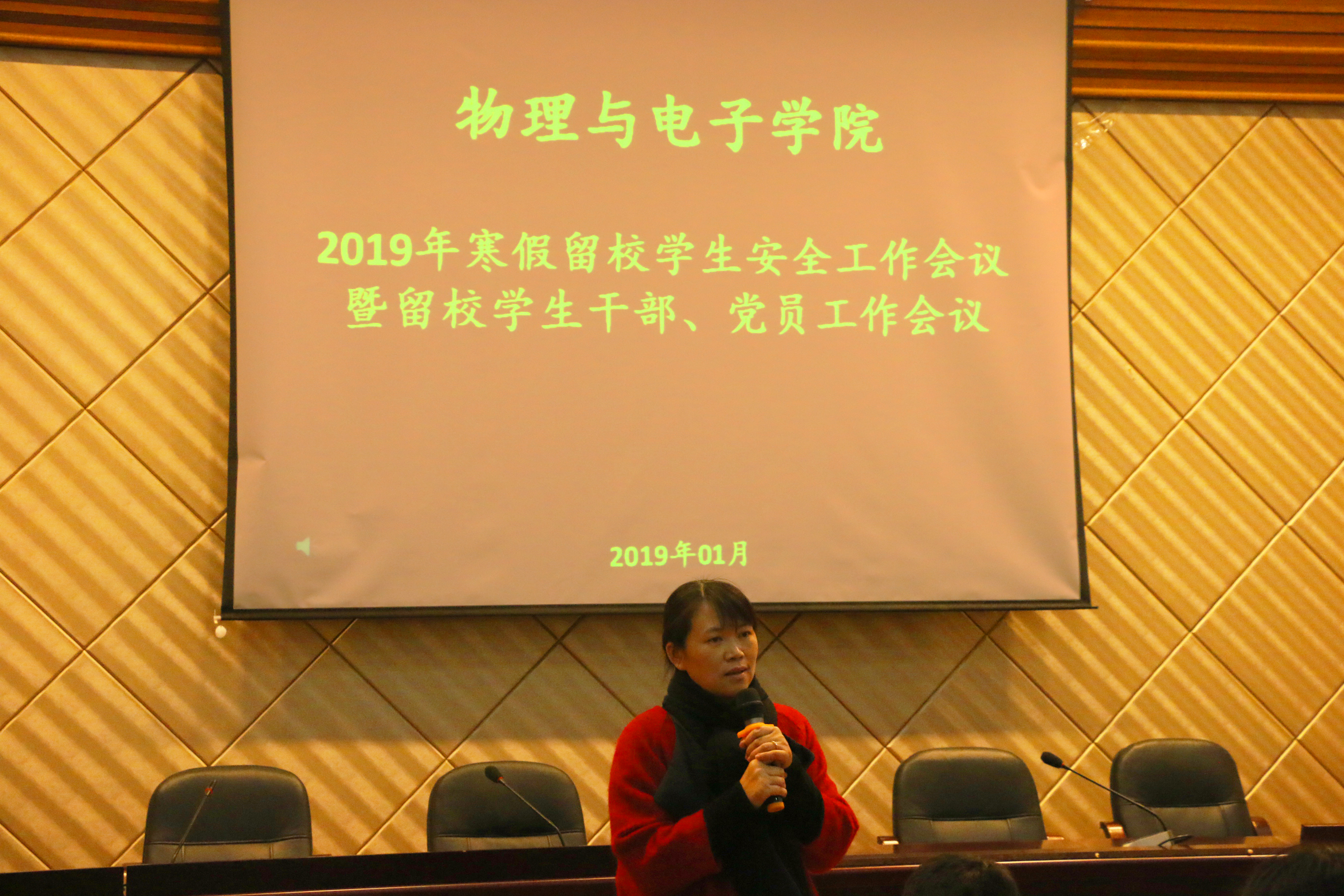 1月21日上午,物理与电子学院2019年寒假留校学生安全工作会议暨留校学生干部、党员工作会议在物理楼116报告厅举行。物电院党委副书记谢群,全体辅导员及全体寒假留校学生参加了会议。会议由辅导员邬永嘉主持。