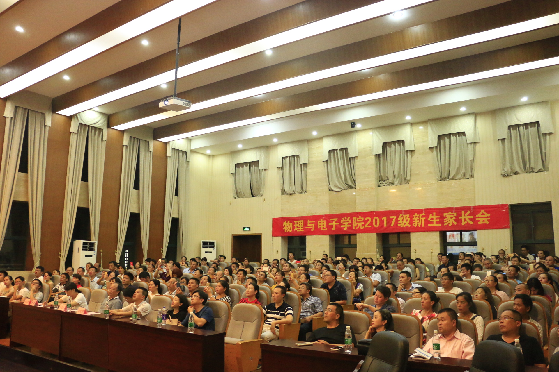 9月8日晚7:00,物理与电子学院2017级新生家长会在物理楼116报告厅顺利召开,院党委书记许宏武、党委副书记谢群、副院长孙克辉、徐富新等院领导,全体辅导员、新生班导师,以及200余名新生家长代表参加了本次会议。大会由学工办副主任钟旭东主持。
