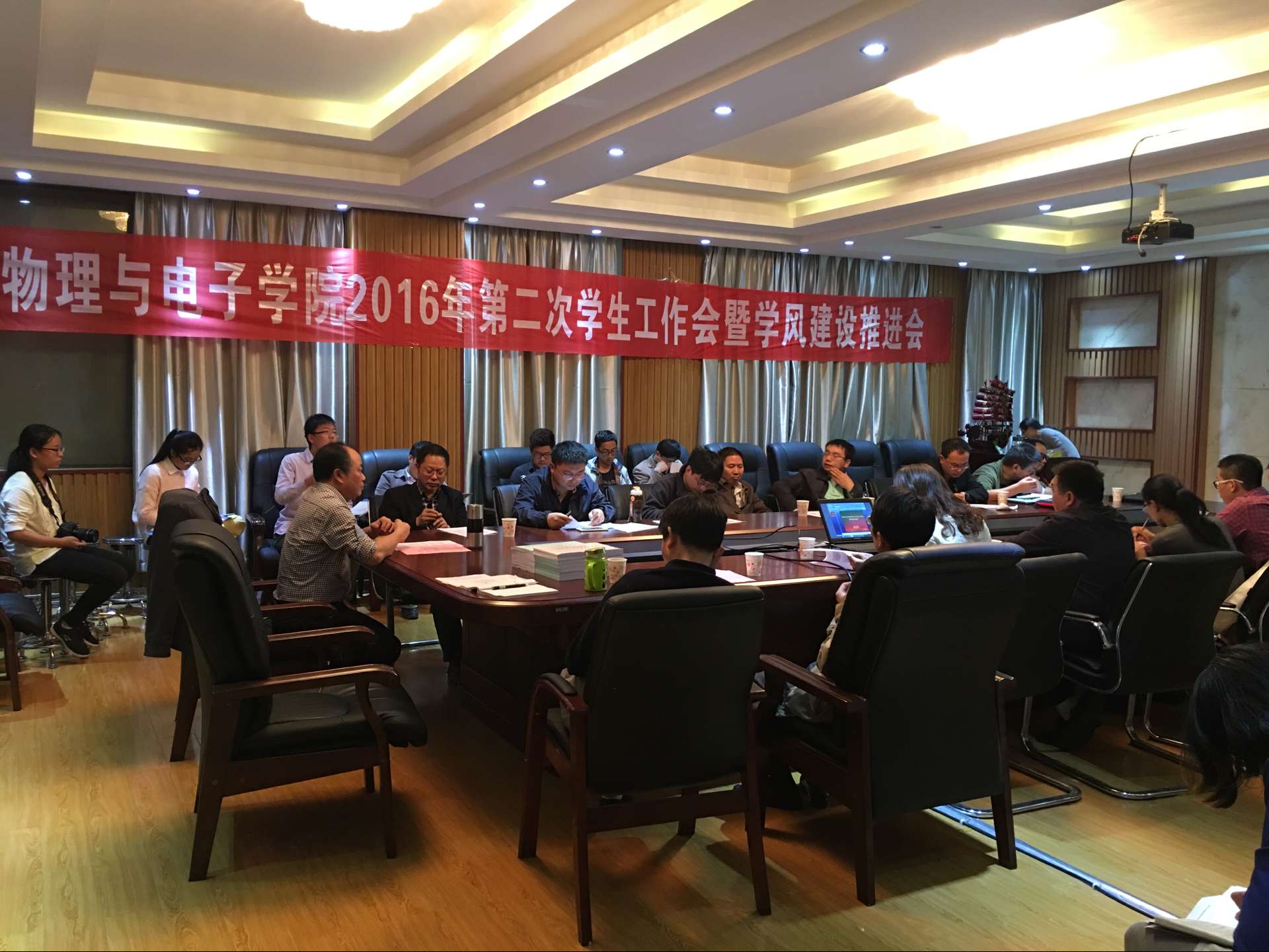 为进一步贯彻落实学校“优化学风建设,提高教学质量”推进会精神,全面落实全员育人机制,10月19日下午3:00,物理与电子学院2016年第二次学生工作会议暨学风建设推进会在物理楼345会议室召开。全体院领导,各系(所)、中心主任、支部书记、分管教学的副主任,教师代表,辅导员,班导师,本科生及研究生代表参加了本次会议。